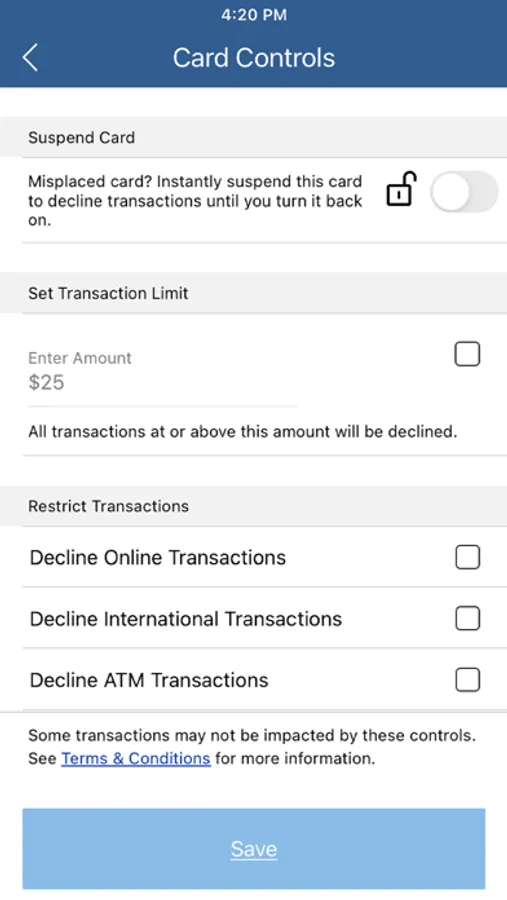 •Secure your card with On/Off feature and set transaction limits and restrictions