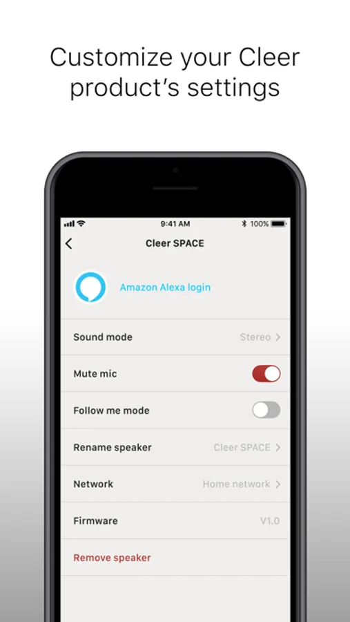 The main function of the app is to help Cleer Space Speaker to connect to a Wi-Fi and login with Amazon. Additionally, user can use it to manage the speaker such as change name and volume, mute, and upgrade.