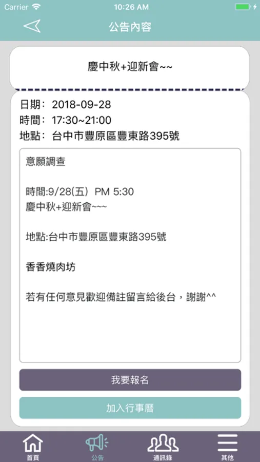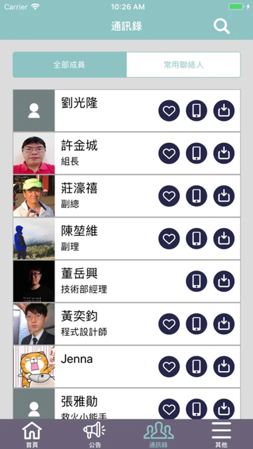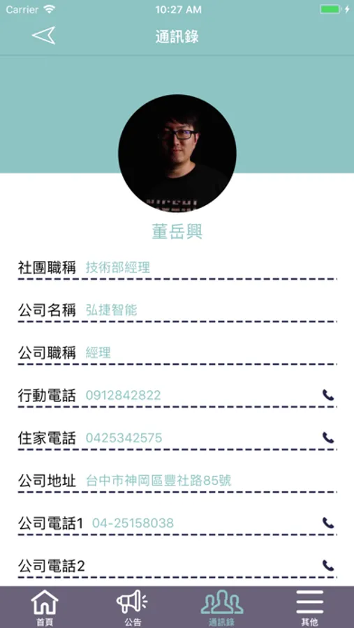 弘捷智能通訊錄(APP名稱)App提供了會員詳細資料,各個會員可透過此App查詢其他會員資料,功能如下