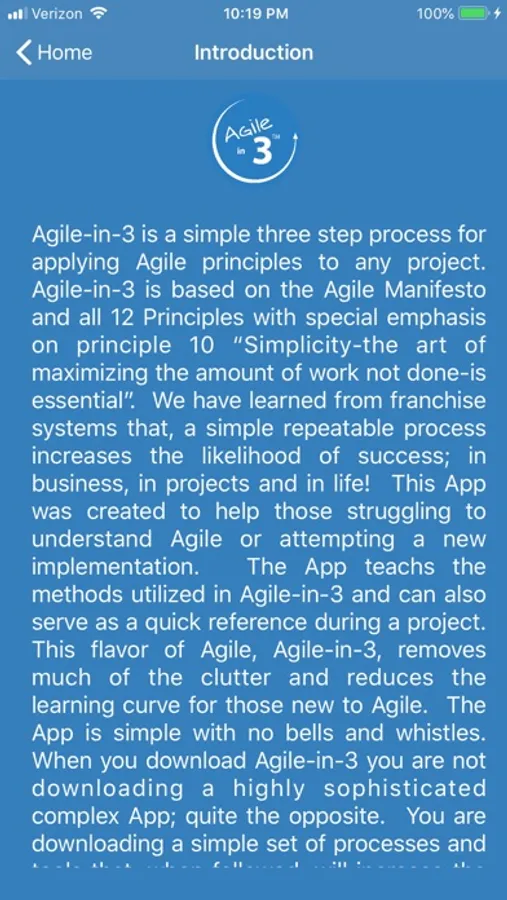 Agile-in-3 is a simple three step process for applying Agile principles to any project. Agile-in-3 is based on the Agile Manifesto and all 12 Principles with special emphasis on principle 10 “Simplicity-the art of maximizing the amount of work not done-is essential”. We have learned from franchise systems that, a simple repeatable process increases the likelihood of success; in business, in projects and in life! This App was created to help those struggling to understand Agile or attempting a new implementation. The App teachs the methods utilized in Agile-in-3 and can also serve as a quick reference during a project. This flavor of Agile, Agile-in-3, removes much of the clutter and reduces the learning curve for those new to Agile. The App is simple with no bells and whistles. When you download Agile-in-3 you are not downloading a highly sophisticated complex App; quite the opposite. You are downloading a simple set of processes and tools that, when followed, will increase the probability of project success. The App will continue to evolve with each iteration. Your feedback is appreciated and where applicable, will be applied to improve future releases. We hope you enjoy learning Agile-in-3 easy steps!