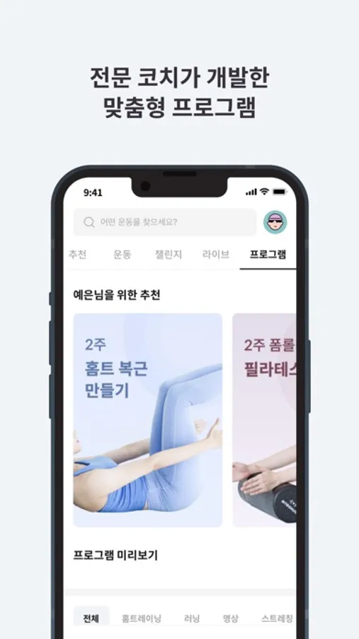 - 필라테스, 실내자전거, 워밍업, 스트레칭, 런닝, 요가, 명상 등 내게 맞는 맞춤형 운동으로 바로 시작해 보세요!