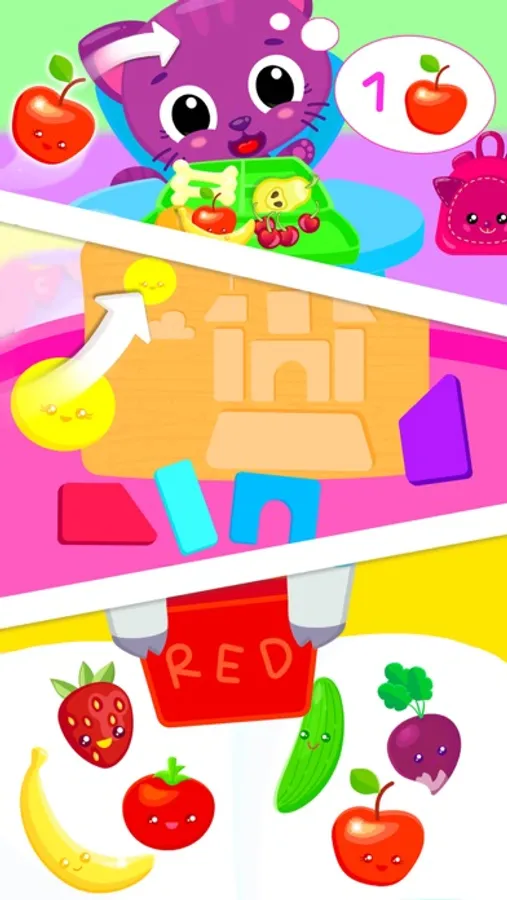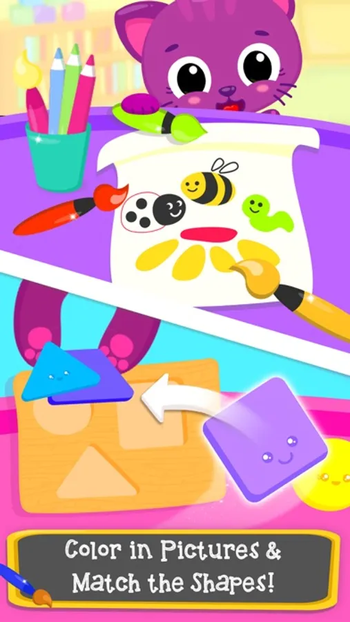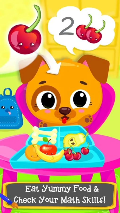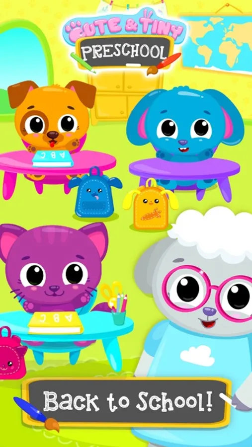 Cute and tiny kitty Sue, puppy Bu and bunny Blu are going back to preschool! Visit their fun kindergarten and develop new skills! Learn to recognize and match shapes, sizes and patterns! Color in cute pictures! Learn to count! Develop fine motor and cognitive skills!