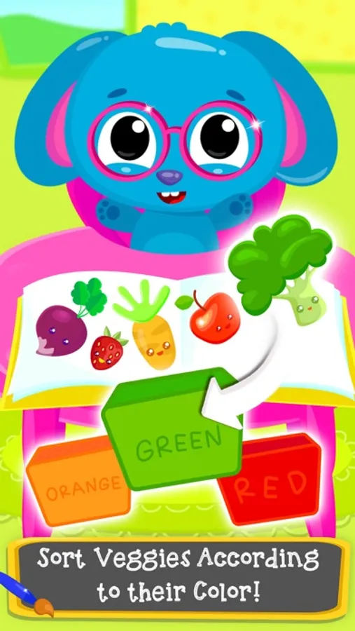Lunch time! Eat yummy fruits and veggies and check your Math skills! Next, the baby animals are having an art class! Color in adorable pictures - choose the right color for each element!