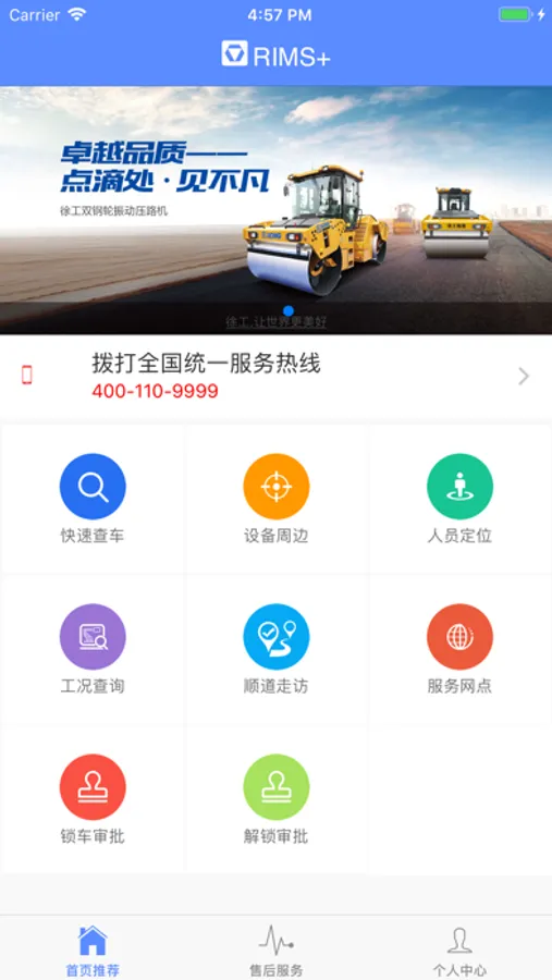 徐工道路RIMS整合售后服务、设备监控、检测设备、信息查询、等业务模块搭建工程机械主机厂和最终用户沟通的桥梁,打造产品智能化、品牌化的终端用户手机客户端。