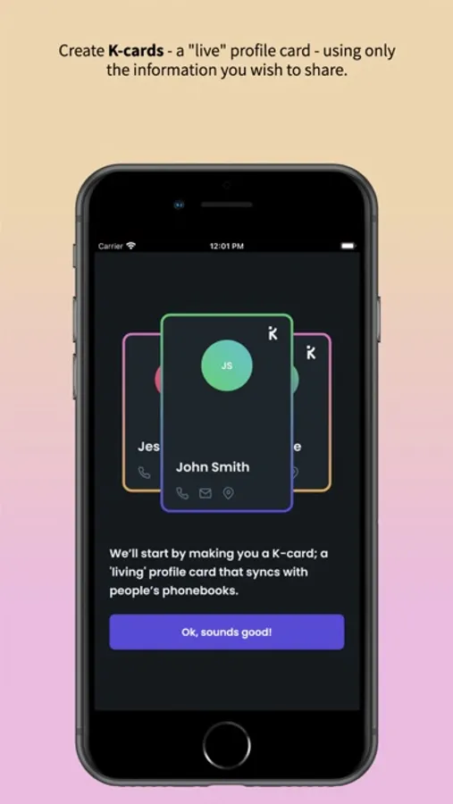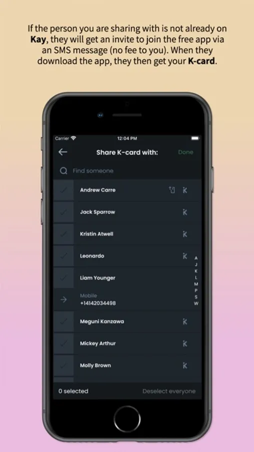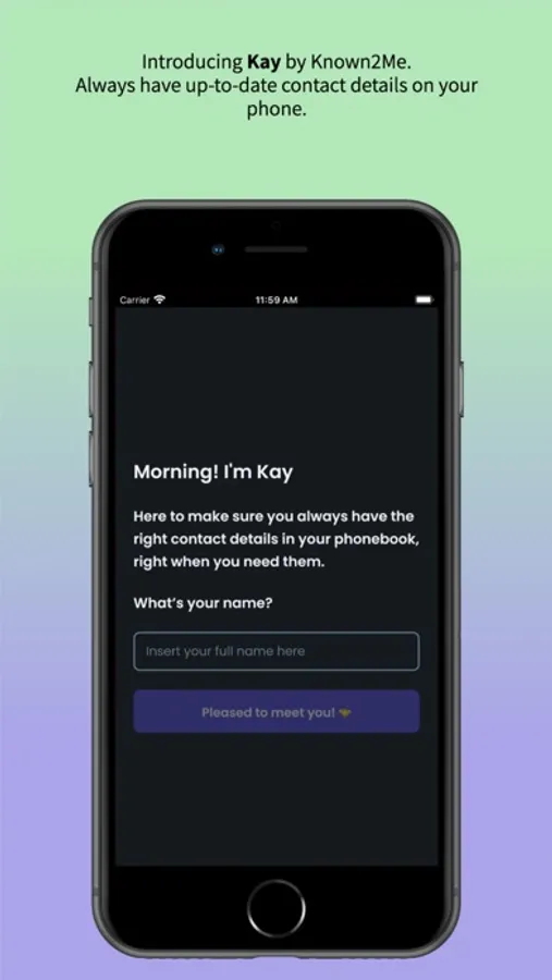 KAY CLEANS YOUR PHONEBOOK: We ask you to sync Kay with your phonebook so when someone sends you a K-card, it will automatically be entered into your phone's addressbook. Also, if they ever make a change to their contact details your phonebook will automatically be updated. Think of Kay as your phonebook's assistant.