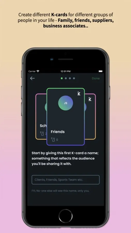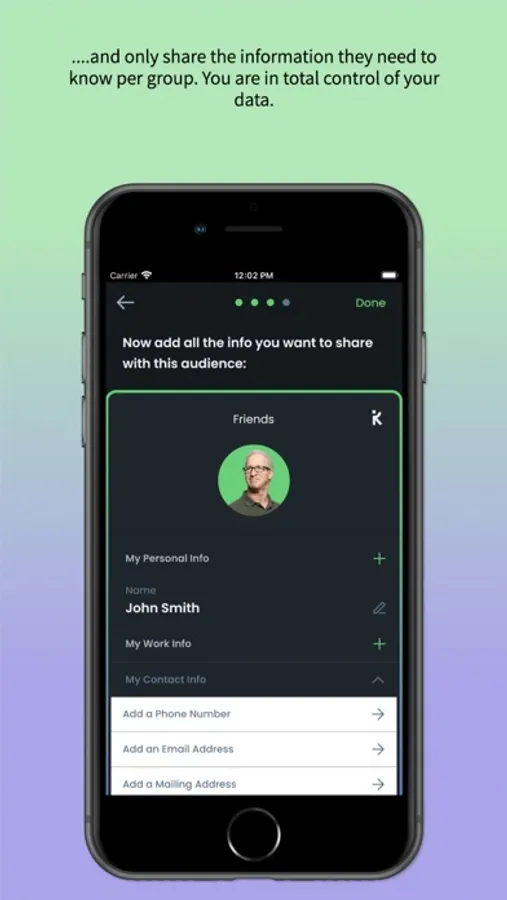 CREATE AS MANY K-CARDS AS YOU LIKE: We all have many personas. The private data you would only share with family and friends should only stay with them. Create a “FAMILY & FRIENDS” profile to share a full set of details. Business associates don’t need all your details, so just share a smaller set of details with them under a “BUSINESS” profile. You’ll see it’s really easy to do and control.