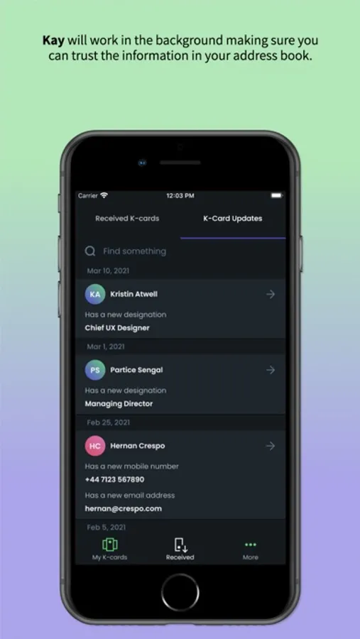 NO DATA ENTRY: Kay makes it easier to share contact details. Send your details to a person you just met in seconds. They won’t need to manually type it and when they reciprocate neither will you. That’s a productivity WIN!