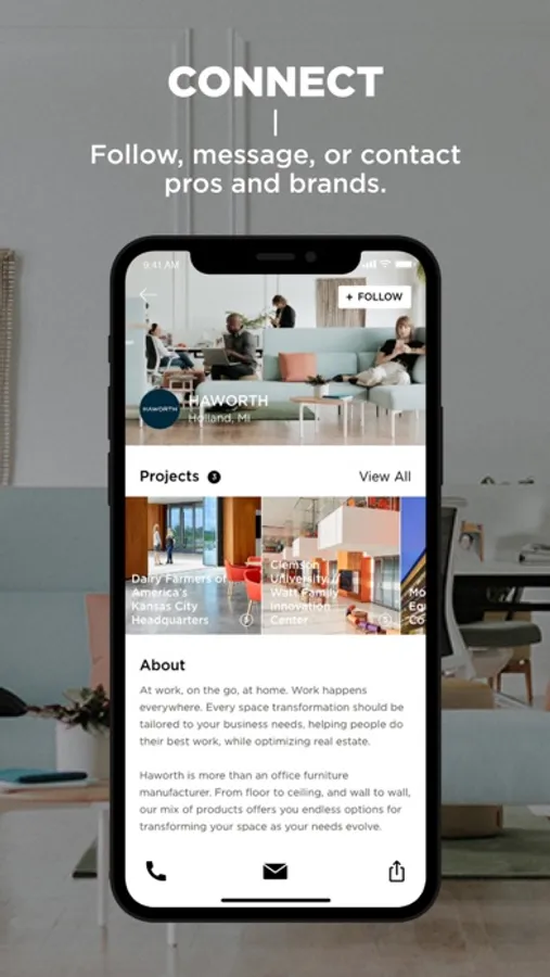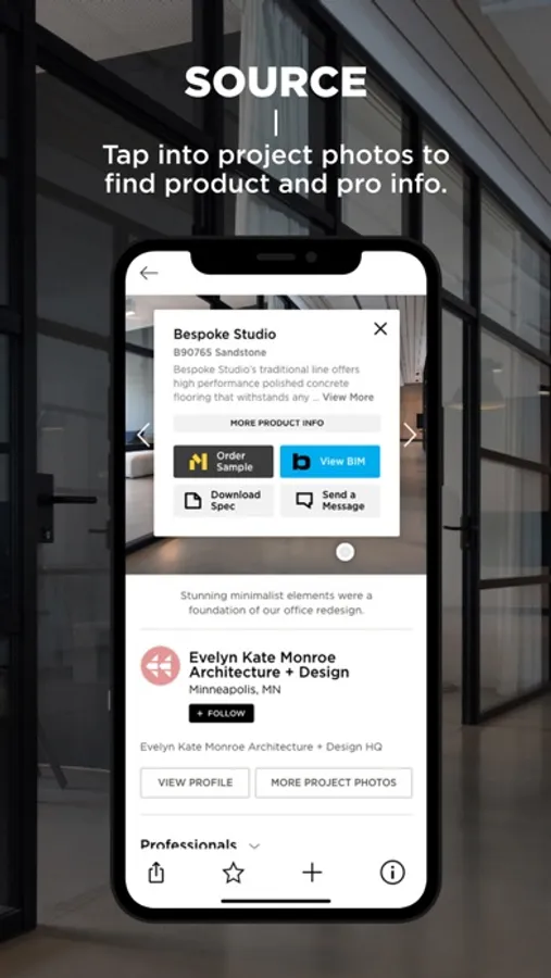 Project and installation photos on Mortarr come standard with pro and product tags. So now you can see a cool light in a conference room photo and easily find out how to get it. Tags allow you to gather info and make connections with brands and pros right from the images. Or save photos to access pro and brand info later.