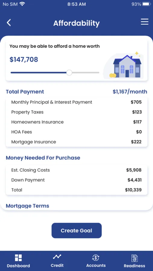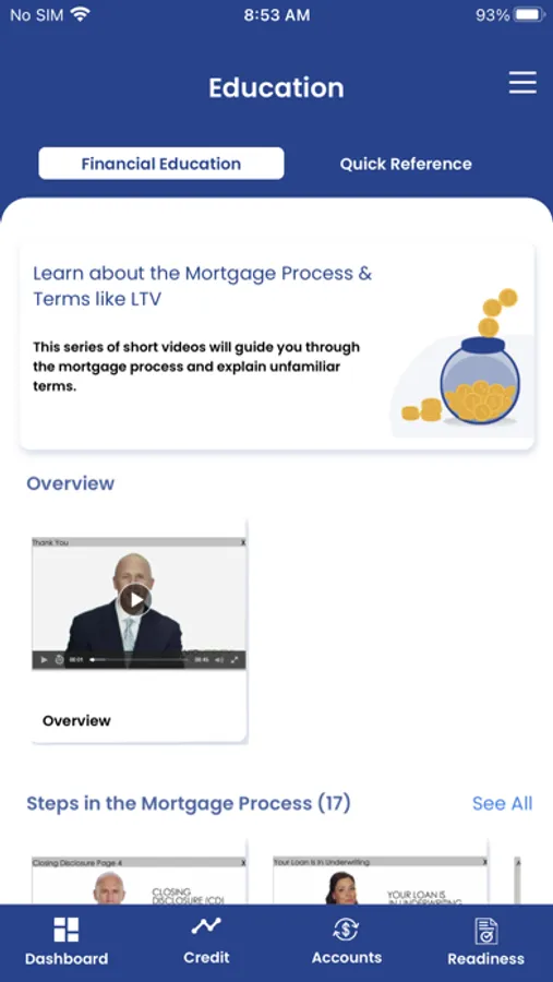 Work with your financial partner or institution to best prepare you for home ownership by planning for a down payment, establishing reserves, managing your debt to income ratio, improving or maintaining your credit, loan scenarios through our calculators, establish your projected loan to value, and more. Visit the readiness assessment in your app to see a snapshot of your credit overview, debt to income ratio, cash reserves, employment, down payment and sales price.