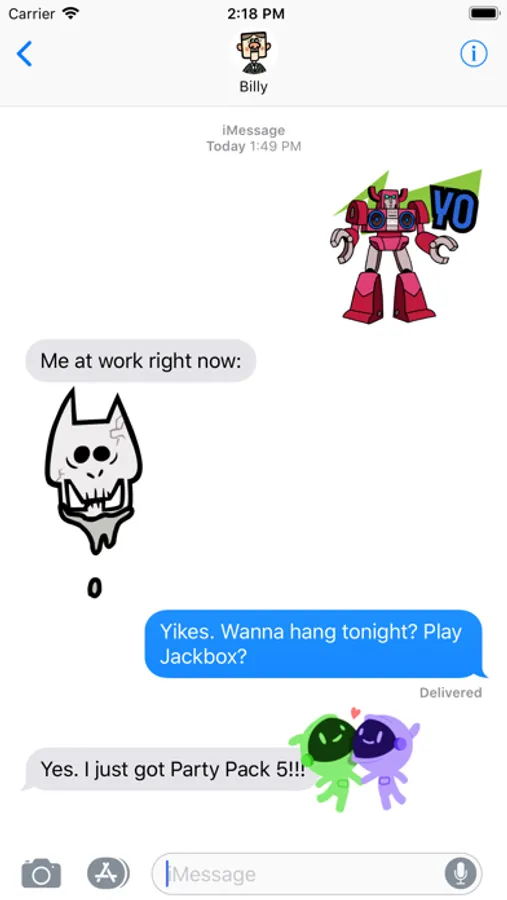 We're bringing the party back to iMessage! Express yourself with this absurd sticker pack of Jackbox Games emojis - now with characters from The Jackbox Party Pack 5! Why type when You Don't Know Jack, Mad Verse City, Split the Room, Patently Stupid, and Zeeple Dome can say it for you? It’s the perfect way to initiate a group game night.