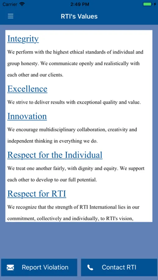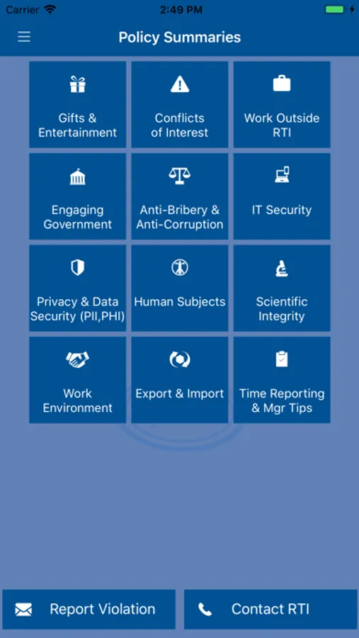 This tool is intended for RTI employees and business partners and provides quick, convenient access to our Ethics and Compliance core program. You will find access to our values, standards, Code of Conduct, policy summaries and more.