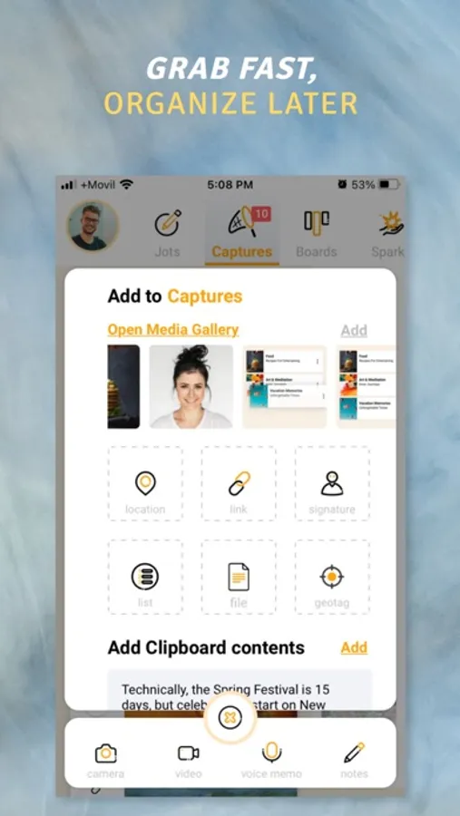 • Don't miss a thing on-the-go with camera, video, audio, location-grabber, rich notepad, and link maker, all in-app.