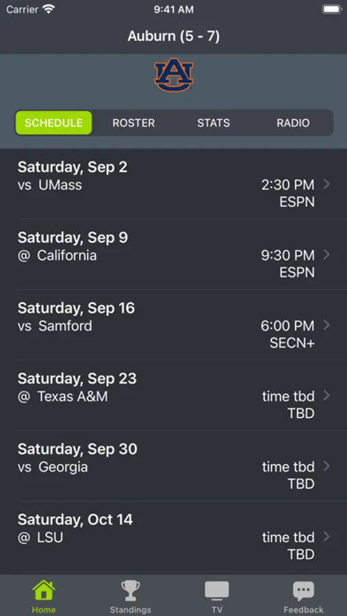 Auburn Football provides scores, links to live radio, schedules, tv channels, player profiles, and game matchups in one location.