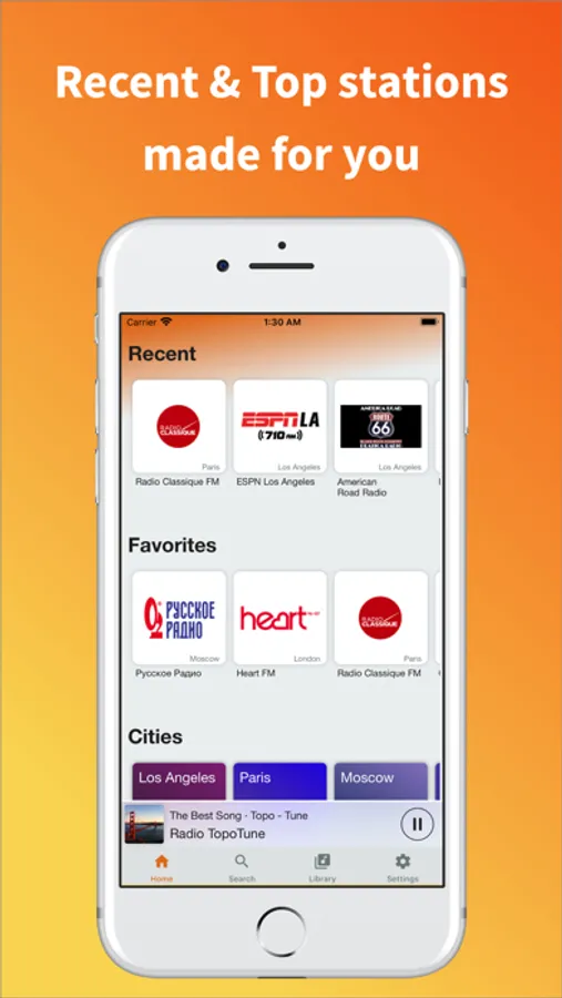 • Browse your recent, favorite, and suggested radio stations at the Home screen of the app.