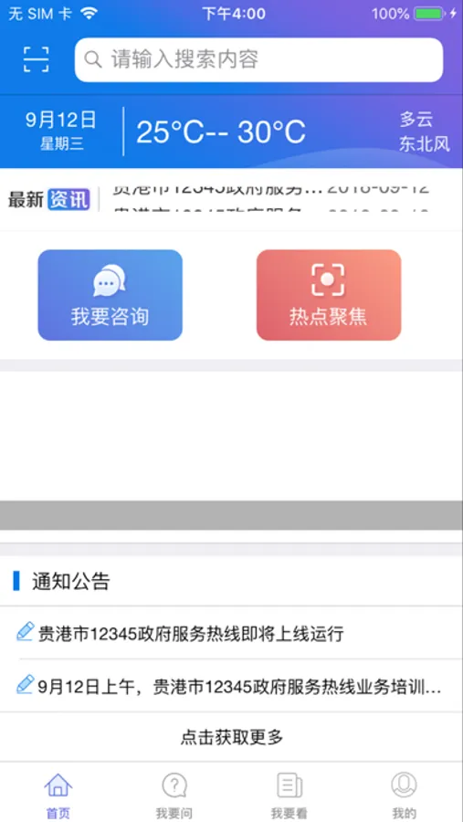 贵港12345时贵港便民服务中心推出的一款便民应用,提供最新资讯、通知给市民,让市民了解身边最新实事。还提供在线咨询、投诉,方便市民与中心的交流。