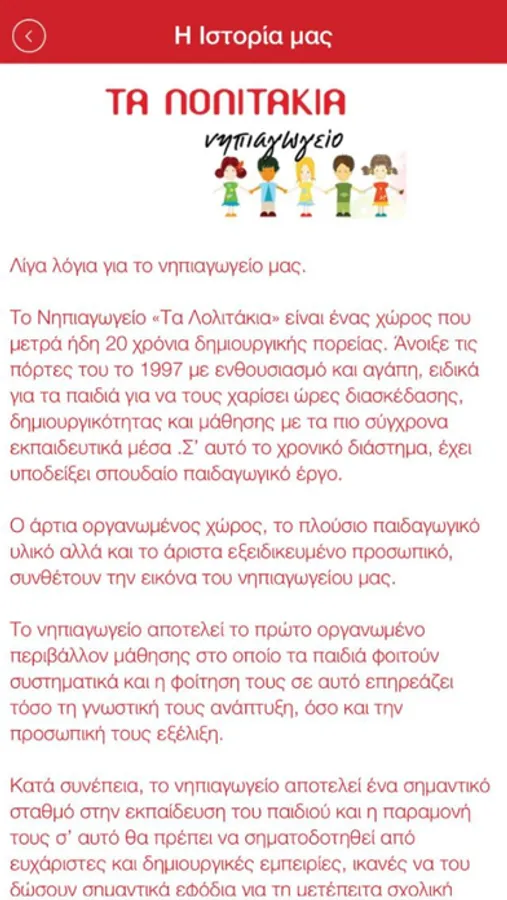 Καλώς ήρθατε στην εφαρμογή του Νηπιαγωγείου "Τα Λολιτάκια". Μέσω της εφαρμογής θα μπορούν οι γονείς, μέσω των κινητών τους, να ενημερώνονται με μεγάλη ευκολία και οποιαδήποτε στιγμή το επιθυμούν, σχετικά με την Τάξη των παιδιών τους και γενικά για τα νέα του Νηπιαγωγείου μας.
