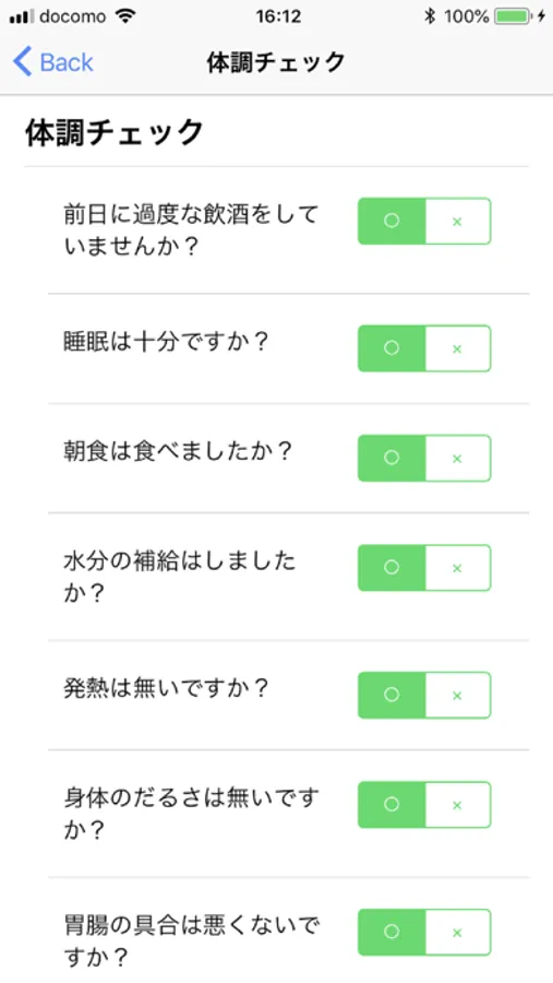 作業前に、作業員の体調のチェックを行い、記録することができます。