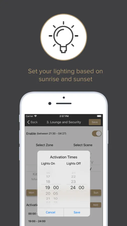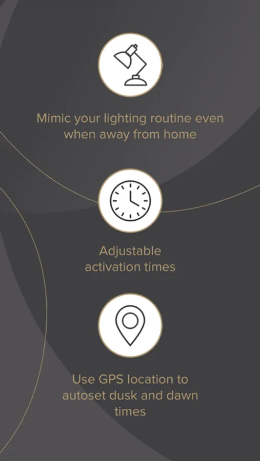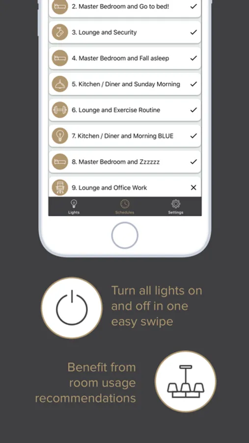 From sunrise to sunset, you can set and save up to 10 timed scenes for a particular day and adjust on/off activation times within specific rooms.