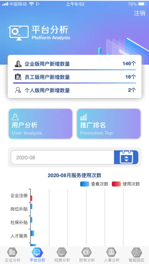 双创分析是针对双创服务平台推出的一款数据可视化/分析工具,帮助企业用户查看企业分析、平台分析、招商分析、财务分析、人事分析的数据,为每一位用户提供及时、可靠、精确、高效的信息,可以得到适应于用户的更优质的体验。