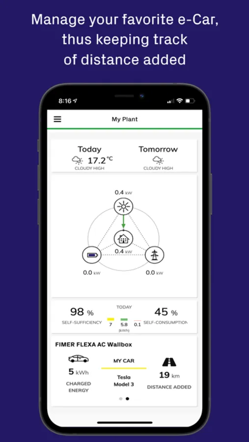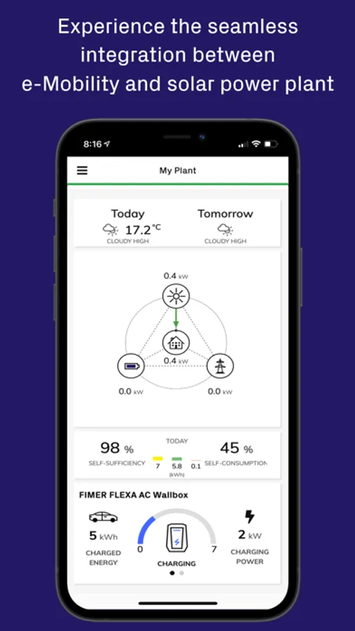 - Compatible with FIMER FLEXA AC Wallbox: configure and manage your e-Car, remotely monitor charging process and trends;