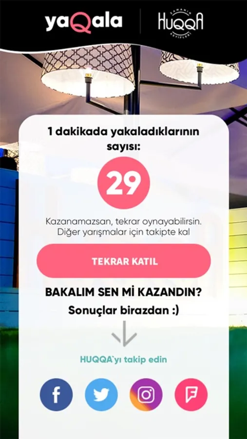 Farklı zamanlarda, farklı mekanlarda yapılacak yarışmalara katılabilmek için uygulamamızı indirin. Anlık olarak oluşturulacak yarışmalara karşı hazırlıklı olun! Sürpriz ikram ve hediyelerimiz için beklemede kalın.