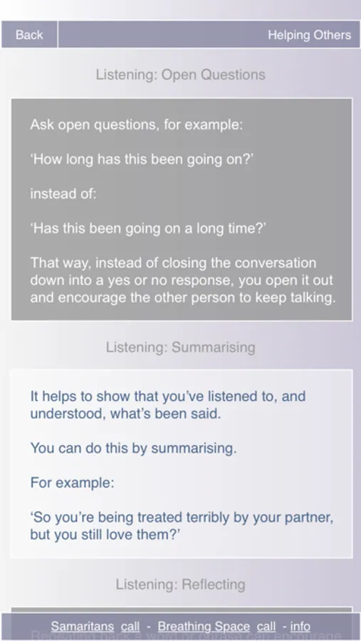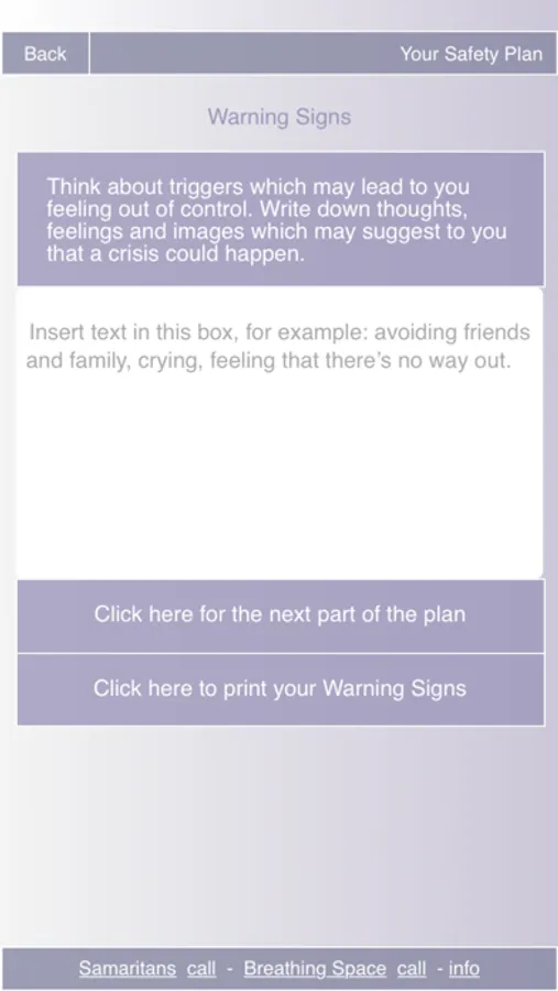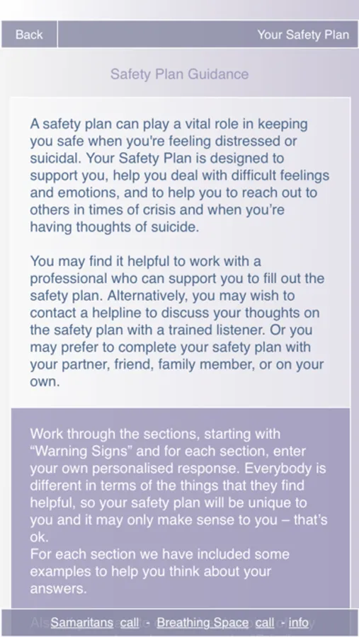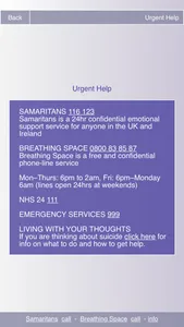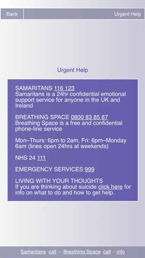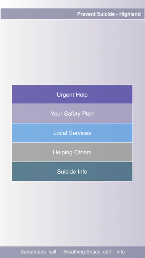 A suicide prevention app aimed at users in the Highland region of Scotland. Provides helpful info for those affected in any way by suicide, extensive contact details for services across the Highland area as well as allowing users to create their own safety plan.