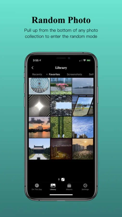 Random photo: pull up from the bottom of any albums to enter the Random mode, scroll left or right to pick another random photo. Favorite the photo if you like it or delete the obsolete one. Or add the photo to albums.
