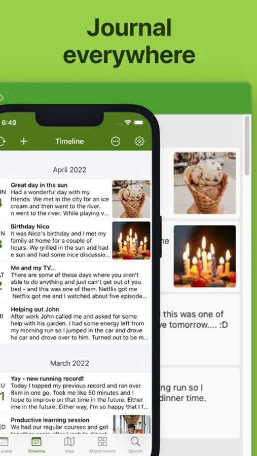 • Attach pictures, drawings, audio recordings, files, tags, people, ratings or locations to your diary entries