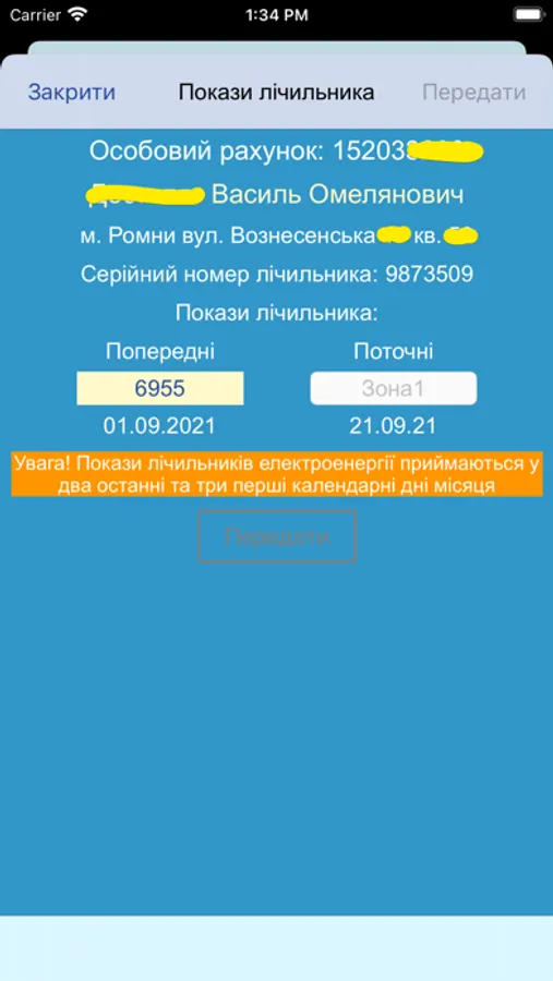 • передавати поточні покази лічильника електричної енергії
