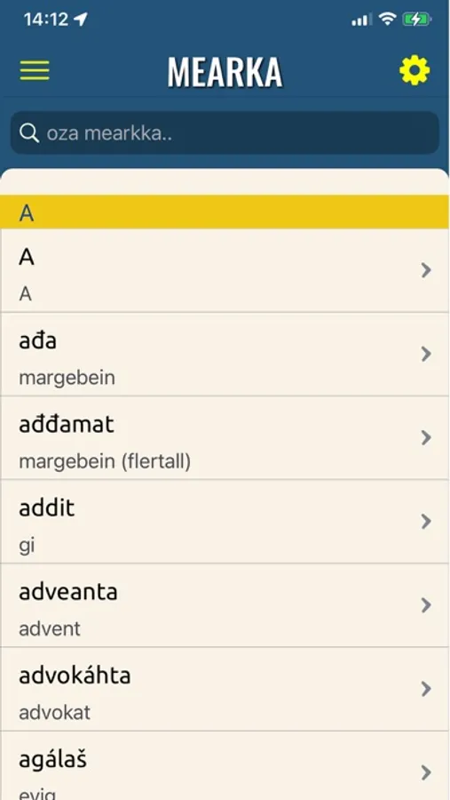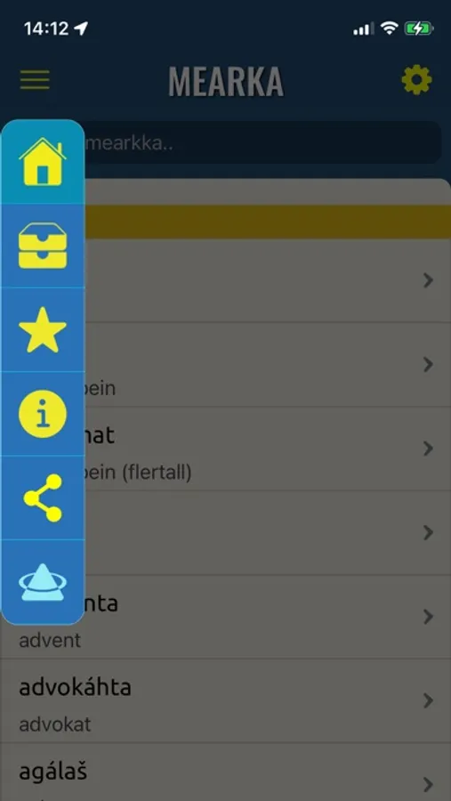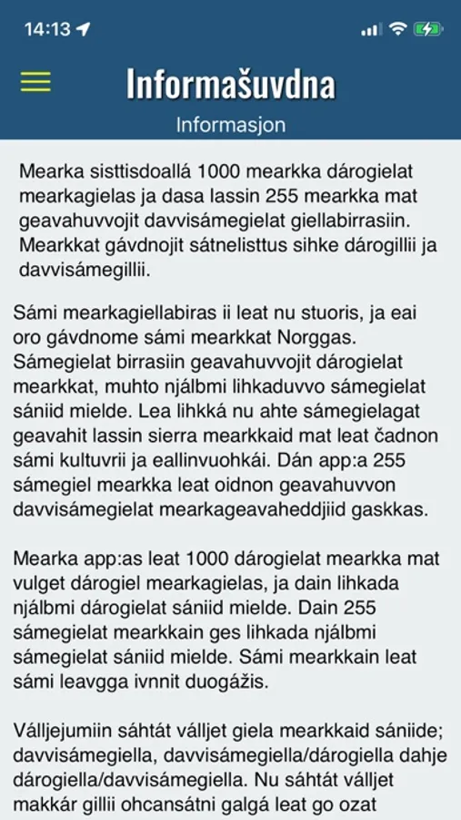 Mearka app:as leat 1000 dárogielat mearkka mat vulget dárogiel mearkagielas, ja dain lihkada njálbmi dárogielat sániid mielde. Dain 255 sámegielat mearkkain ges lihkada njálbmi sámegielat sániid mielde. Sámi mearkkain leat sámi leavgga ivnnit duogážis.