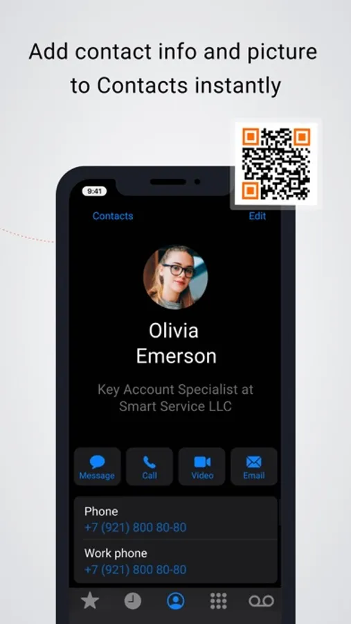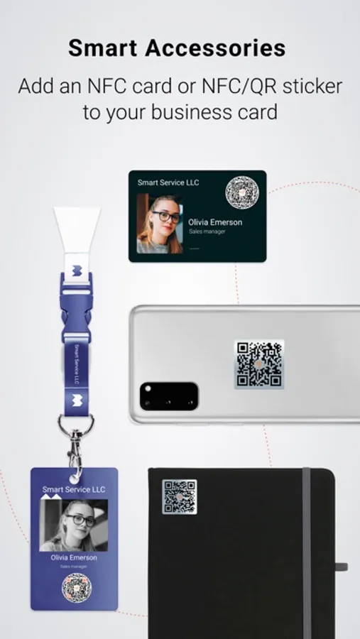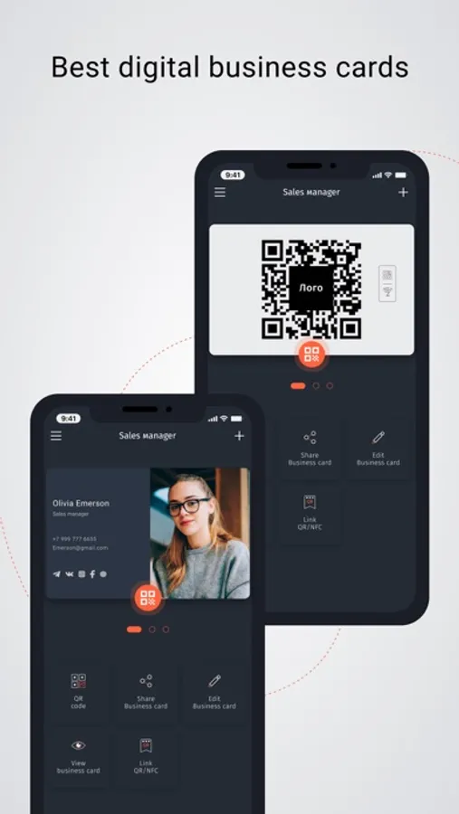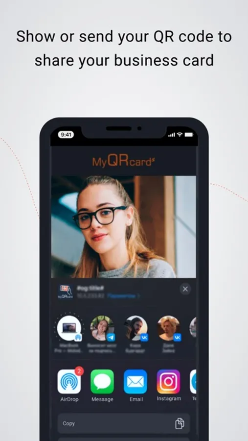 Share your business card with one tap: directly in the app, or using a QR-code, or an additional smart medium (NFC-card, NFC-tag, QR/NFC-sticker, QR-badge or desktop sign with an electronic business card). Show the QR-code using the application or just click the button to send the link via SMS, WhatsApp or any other messenger.