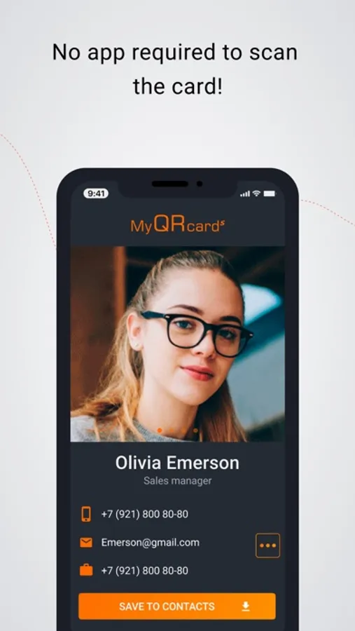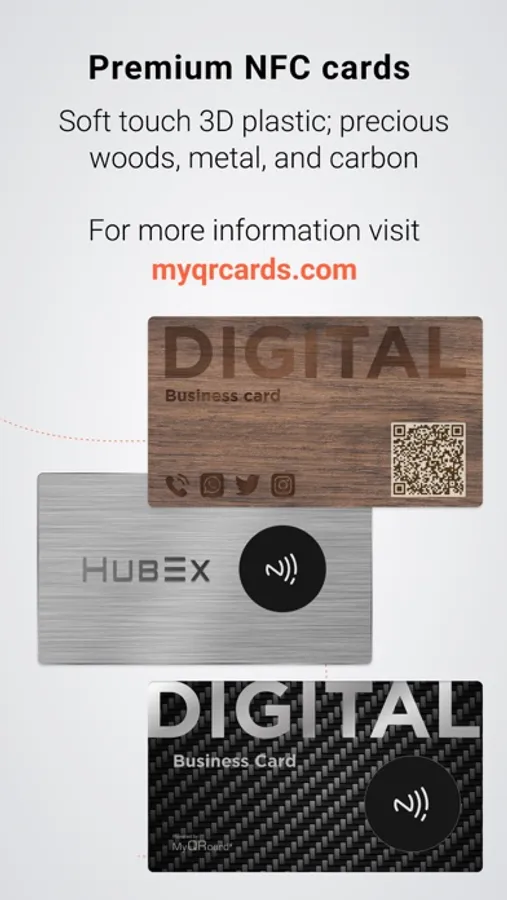 In addition to the business card created in the app, you can order a QR or NFC-card, as well as a QR or NFC-sticker made of various materials: soft-touch 3D-plastic, precious woods, metal or carbon (for more details please visit our website: MyQRcards.com).