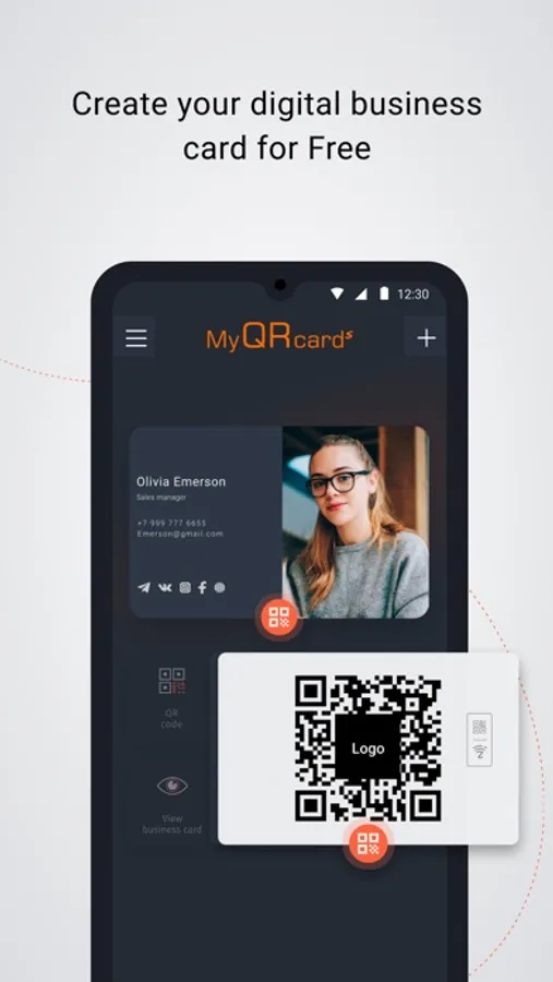 Create business cards directly in the app within 30 seconds and share them when meeting someone or online. Add the QR-code from your business card to the conference background by taking a screenshot of the QR-code and placing it in the back in Zoom, Skype or Teams (to do this you need to use any other application where it is possible to insert a QR-code image).