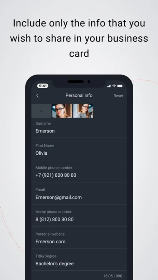 The paid version allows you to create up to 10 electronic business cards: various business cards for projects, for business trips, etc.