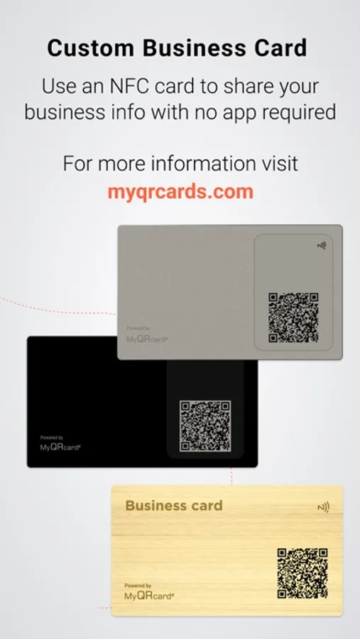 The use of an NFC-card will help you share your business card even without opening an application. Branded ‘MyQRcards’ cards can be linked to any business card an unlimited number of times directly in the app.