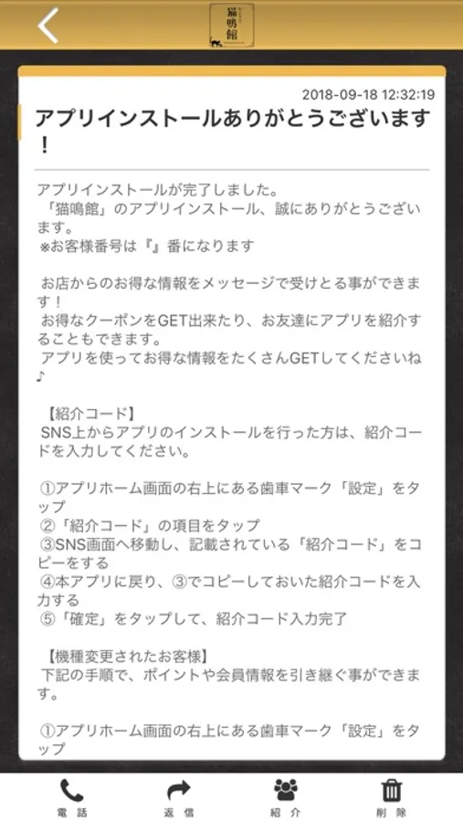 猫鳴館のアプリをSNSを通じてお友達に紹介する事ができます。