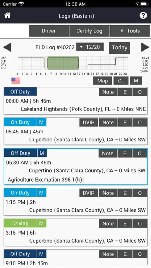 The system puts drivers in complete control, they can add and remove locations, and the system allows for multiple locations of commodity pick up or drop off, which roll continually onto logs until removed, all follow the posted FMCSA rules including the complex A,B,C pick-up/drop-off, en-route empty to source, return empty, and other scenarios as published.
