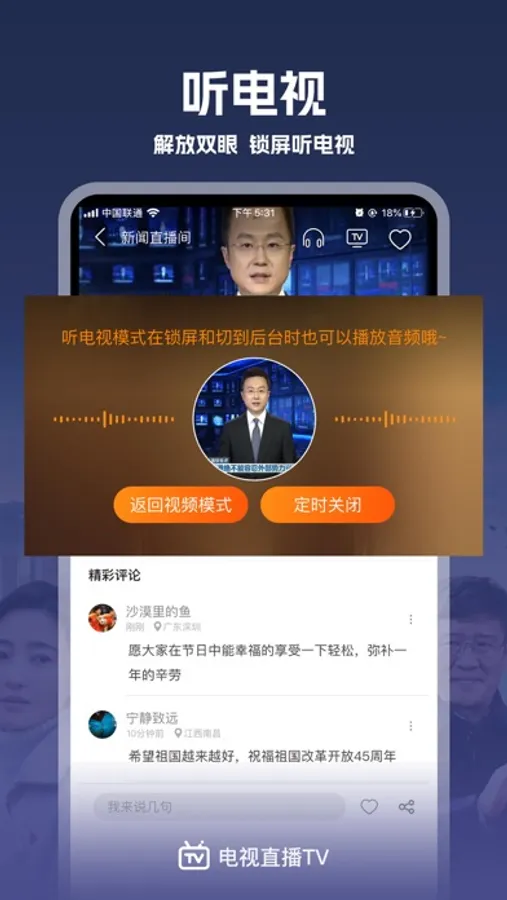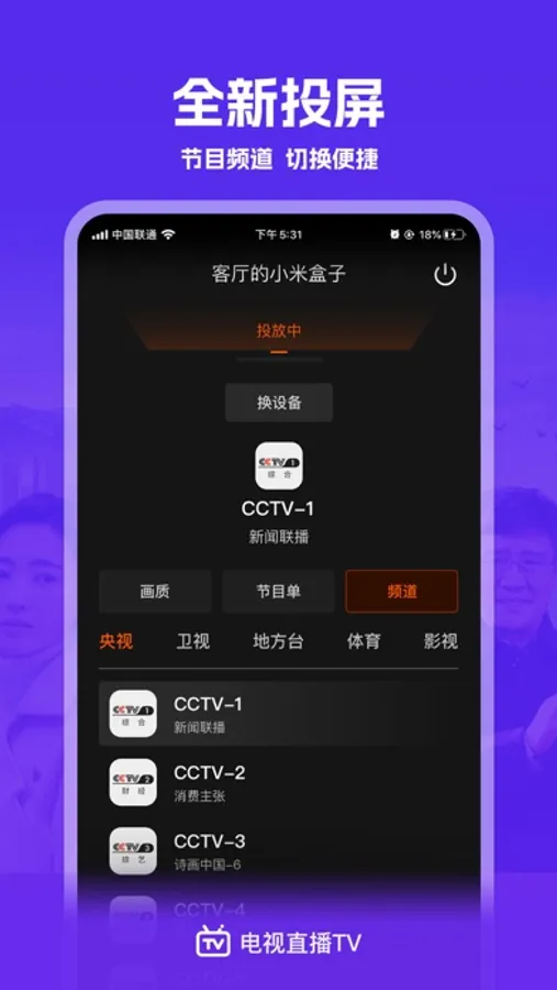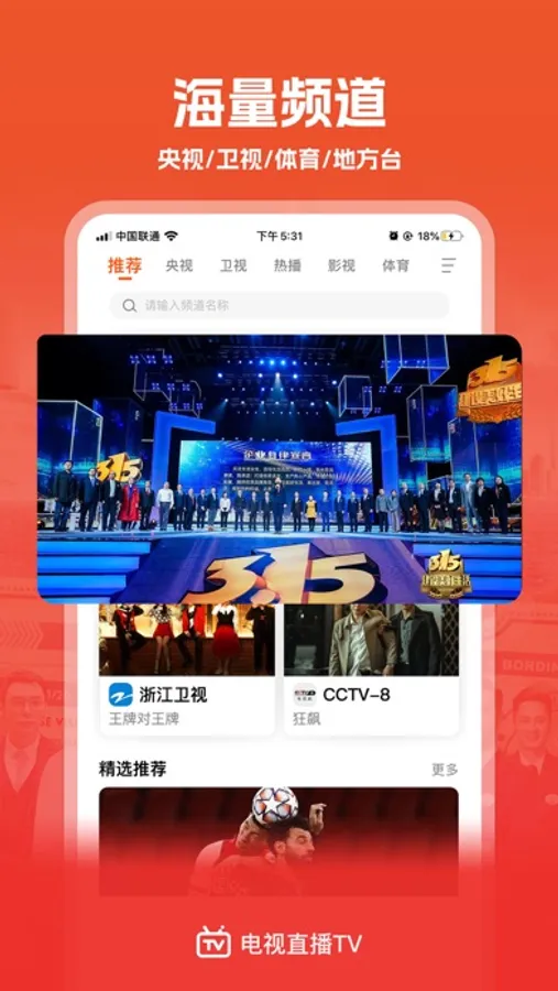 电视直播TV是一款频道齐全、高清流畅的电视直播软件。随时随地用手机看电视,弹幕发言,边看边聊,海量资源,追剧神器~