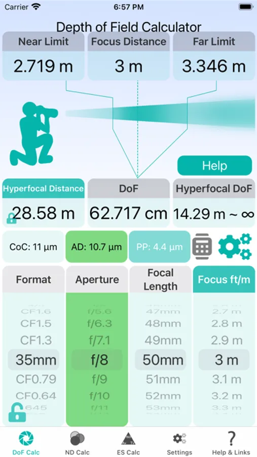 Depth of Field, Neutral Density, Exposure Shift Calculators, and some settings screens have onboarding help with interface element highlighting to help you get to know your new Photographer's Friend.