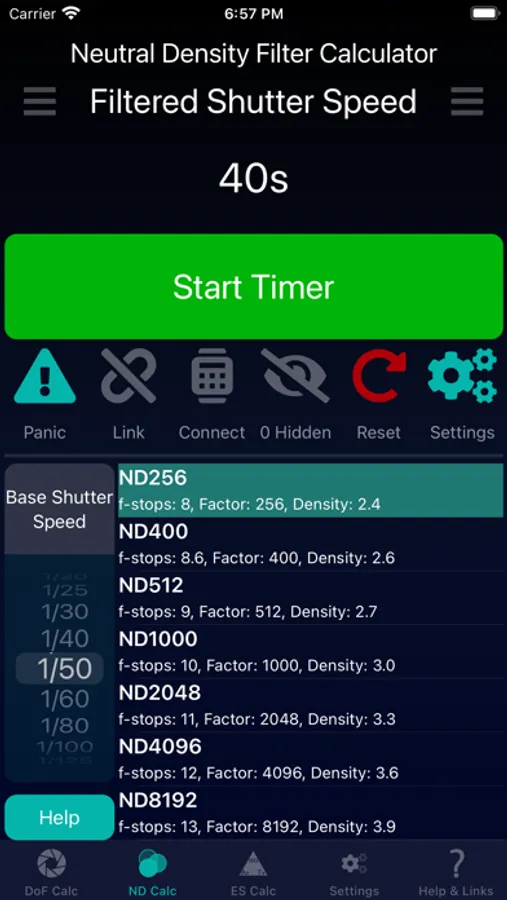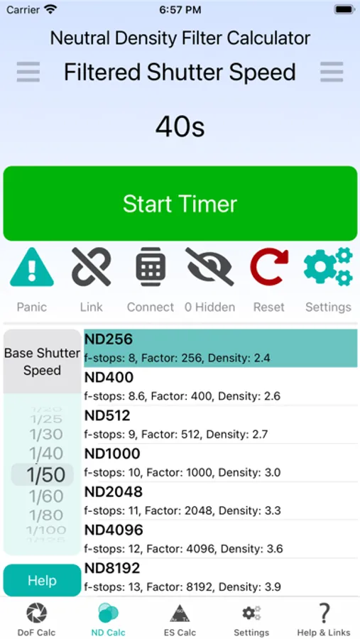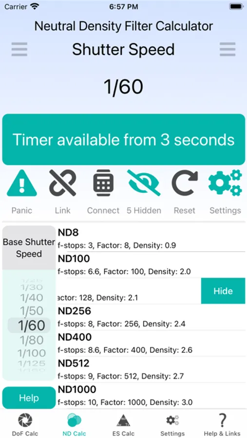Enter your base shutter speed into the Neutral Density Filter Calculator to calculate your new shutter speed after fitting ND filters to your lens. Filter labels include the multiplication factor (ND2, ND4, etc.) with f-stop and optical density values also displayed. You can hide filters that you don't use or bring them back again with slide gestures.