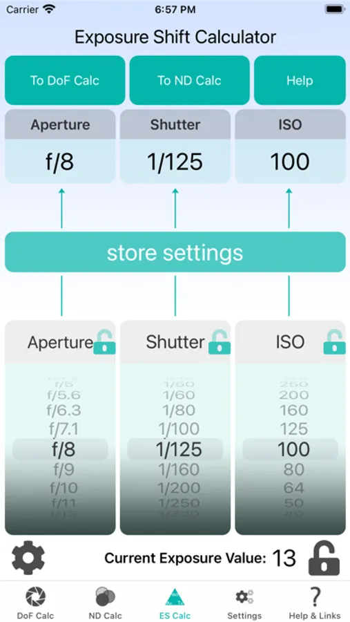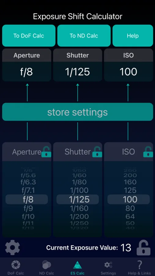 Enter your current camera settings with the Aperture, Shutter Speed, and ISO dials, and watch Photographer's Friend calculate how changes to one dial affect the others. You can lock any of the three dials to calculate the other free dial automatically, or turn on Exposure Value Lock to have Photographer's Friend calculate all settings for you!