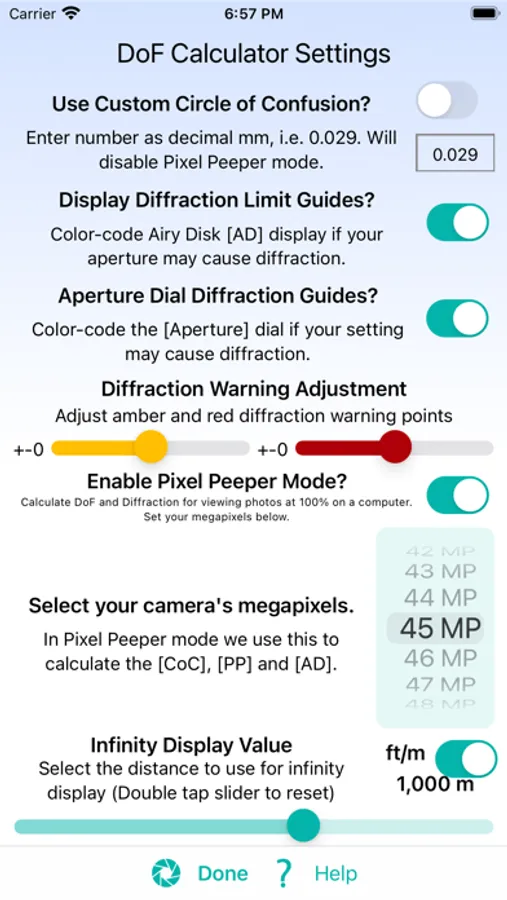 By default, we use traditional Depth of Field calculations, but Pixel Peeper mode calculates Depth of Field using your sensor size and megapixels for higher accuracy. You can also enter a custom Circle of Confusion size if you prefer. There's even a diffraction warning mode!