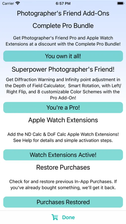 Photographer's Friend is fully functional at the marked price. However, several features such as Apple Watch Extensions and some Pro features available as In-App Purchase as they may not be of interest to everyone. There is also a bundle to save on the multiple individual Add-ons.