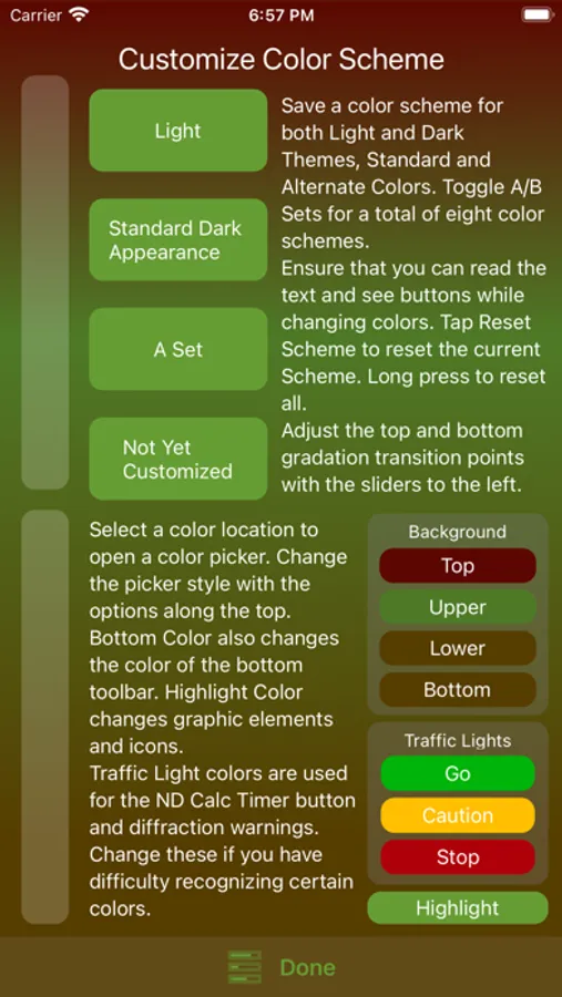 Diffraction Limit guides adjust the color of the Aperture guide when there is a possibility of Diffraction. You can change the Diffraction Limit guide starting points as part of the Pro Add-on available as an In-App purchase.