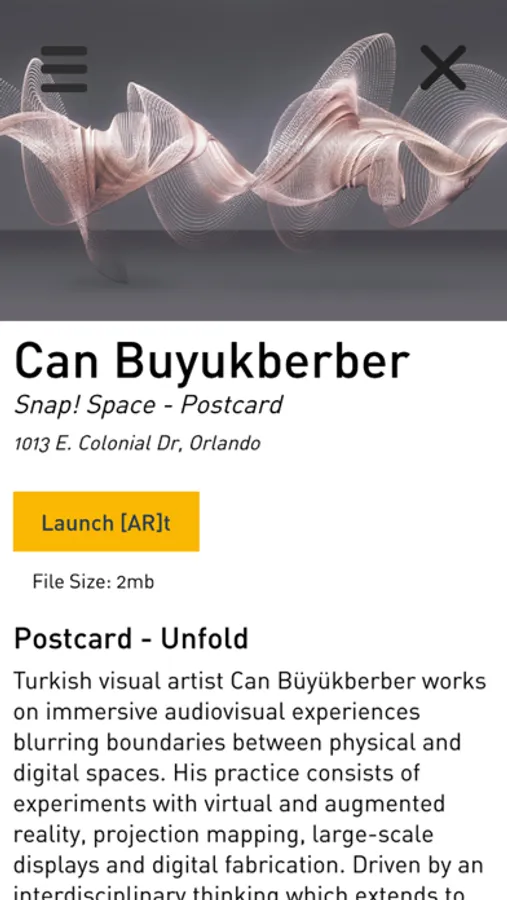 Snap! Orlando's ‘CITY unseen’ is an ongoing public art project with site specific installations across Orlando. This project opens artistic borders by launching the city into Augmented Reality [ AR ] experiences, with fusions of works by internationally renowned artists and cutting-edge AR technology. Experiences include murals coming to life, a projection mapping finding permanence into the virtual world, and a teleport bringing the viewer into a 360 degree visit of an artist’s Los Angeles studio.