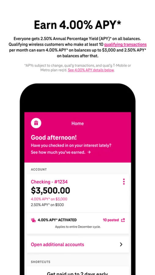 *How APY works: Checking account customers earn 4.00% annual percentage yield (APY) on balances up to & including $3,000 in your Checking account per month when: 1) you are enrolled in a qualifying T-Mobile or Metro plan; 2) you have registered for perks with your T-Mobile ID; & 3) at least 10 qualifying transactions have posted to your Checking account before the last business day of the month. Qualifying transactions posting on/after the last business day of the month count toward the next month’s qualifying transactions. The first time you fund your account, as an added value, you’ll receive 4.00% APY on balances up to/including $3,000 in the statement cycle in which you make your first deposit of greater than $1, as well as in the cycle that follows that deposit provided all other requirements are met. These added value benefits are subject to change. Balances above $3,000 in the Checking account earn 2.50% APY. The APY for this tier will range from 4.00% to 3.40% depending on the balance in the account (calculation based on a $5,000 average daily balance). Customers who do not qualify for the 4.00% APY will earn 2.50% APY on all Checking account balances for any month(s) in which they don’t meet the requirements listed above. Savings/Shared Savings account customers earn 2.50% APY on all account balances per month. You must have a T-Mobile MONEY Checking account that is in good standing & funded to open any type of Savings account. APYs are accurate as of 12/01/22 but may change at any time at our discretion. Fees may reduce earnings.