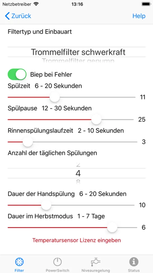 All parameters such as flushing times, number of channel flushes, switching status of the Power Switch outputs and many other settings can be conveniently set via the app. Optional accessories such as pond level regulation or a temperature sensor to display the water temperature are also supported.