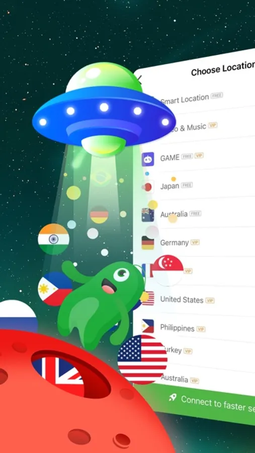 Optimized smart location gives your turbo fast connection speed. Get 3x faster VPN speed by one tap simply.