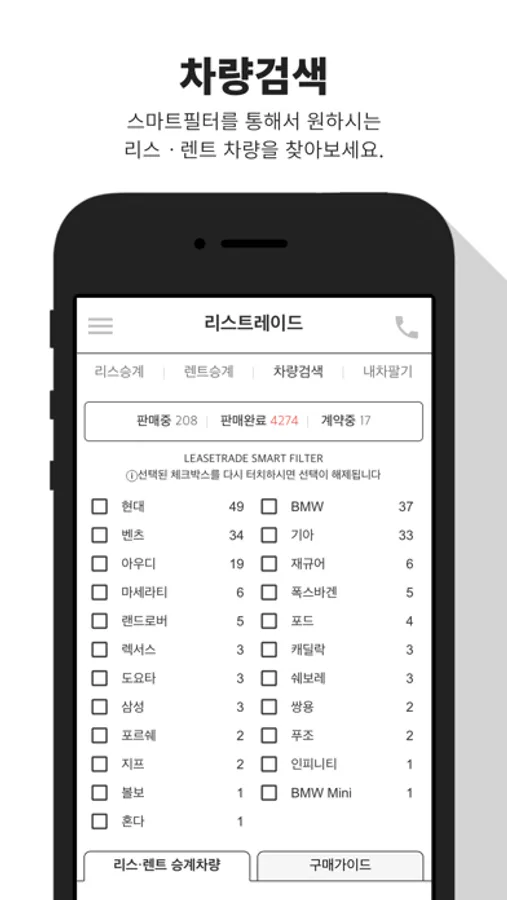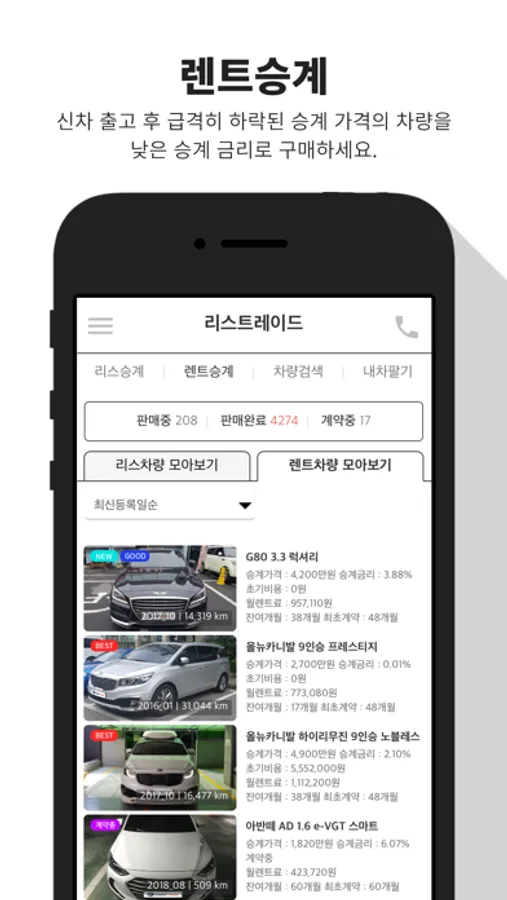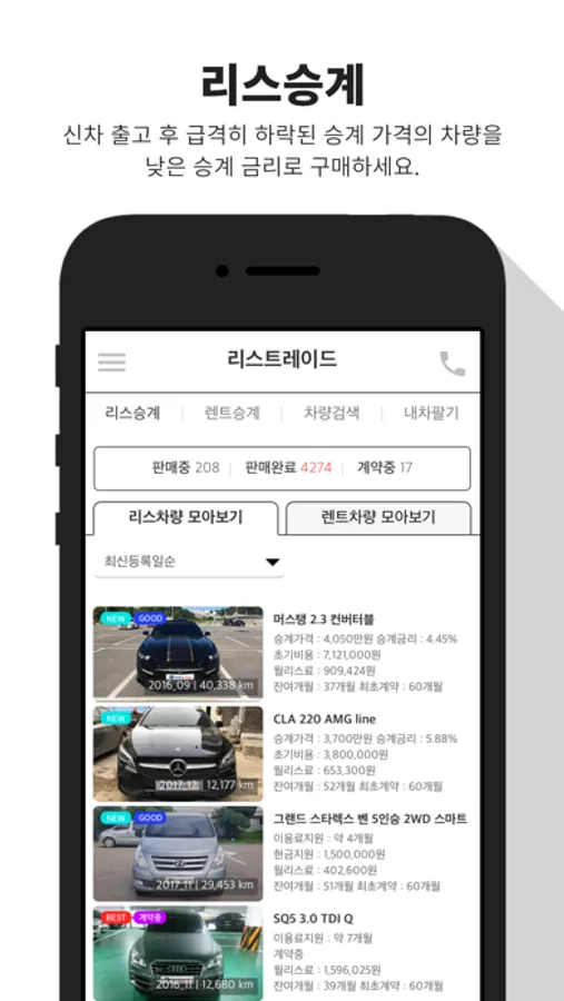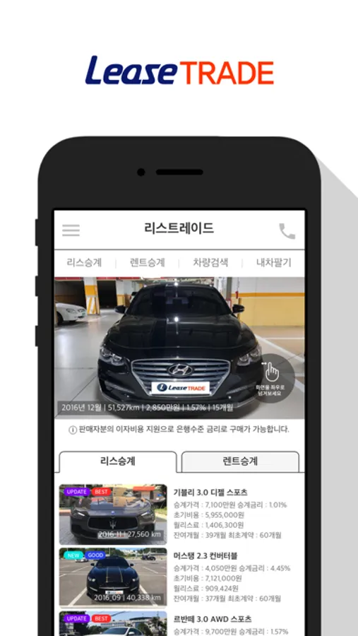 2006년 부터 자동차리스 이용고객과 장기렌트 이용고객의 차량을 승계로 거래해온 리스트레이드의 중개서비스를 이제 앱에서도 제공해드립니다.