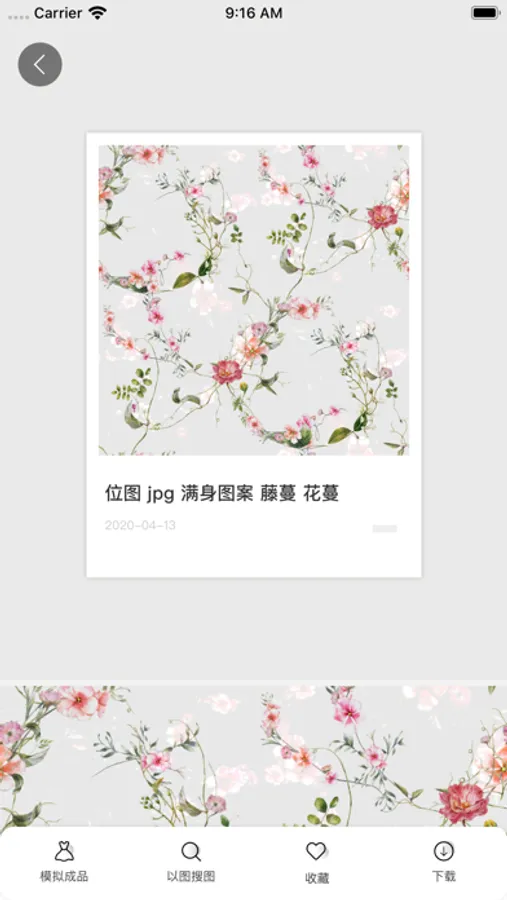 以图搜图:轻松解决识图找图困扰,拍照上传花型,结合大数据算法,从几十万级素材库一键匹配所有相似花型。